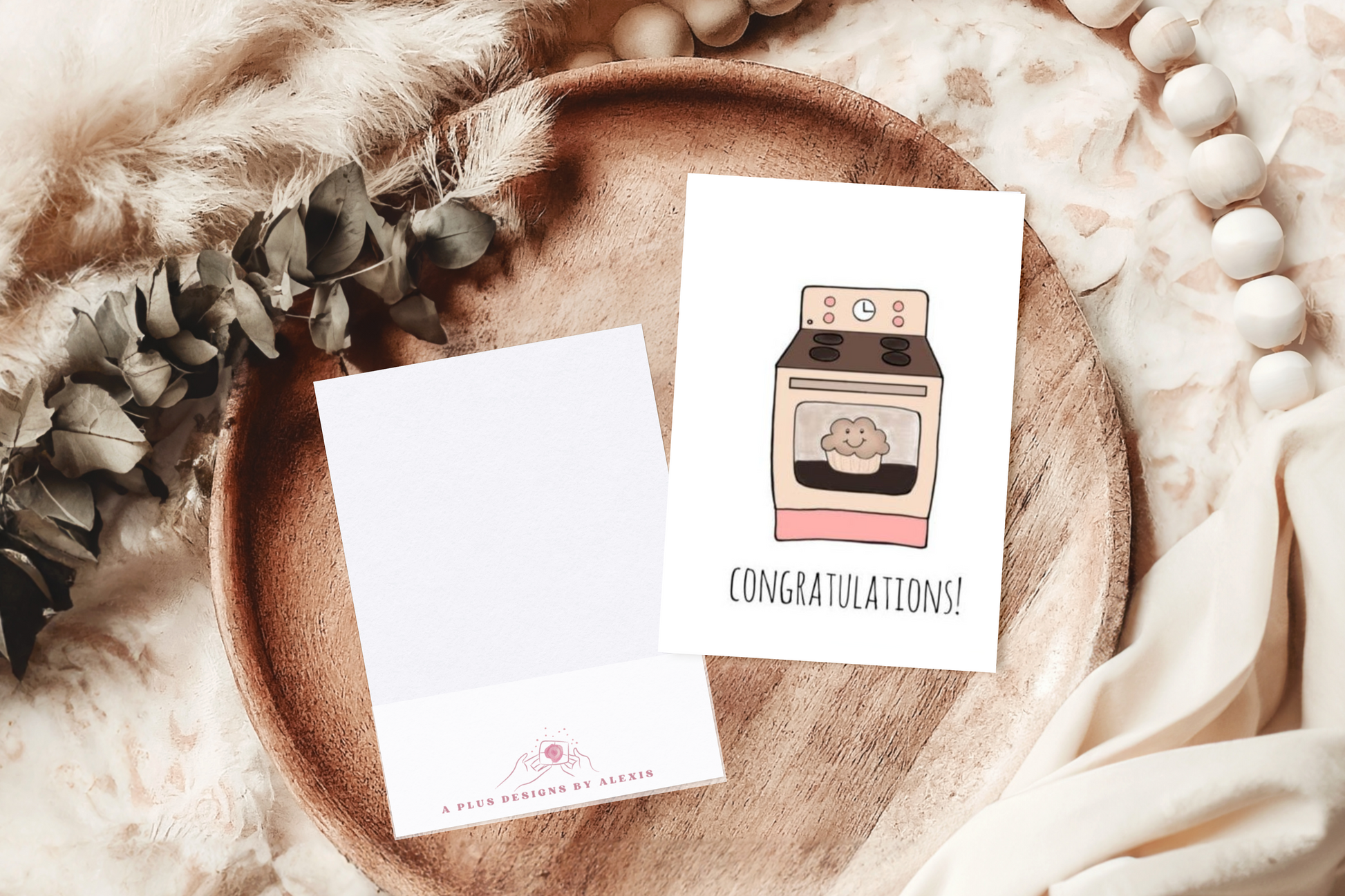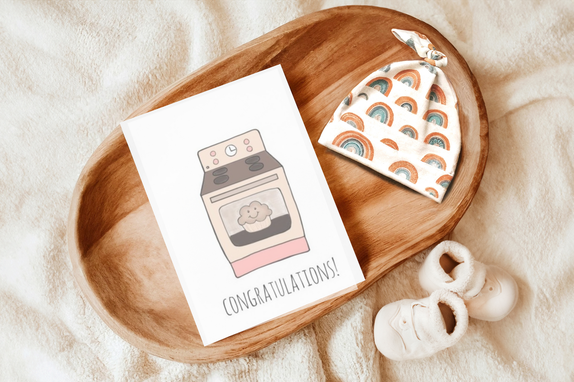 Celebrate a sweet new milestone with this adorable "Congratulations!" card. Featuring a hand-drawn illustration of a oven with a freshly baked cupcake, this card is perfect for announcing a pregnancy, celebrating a baby shower, or sharing the news of a growing family. The playful design is sure to add a touch of joy to any occasion.