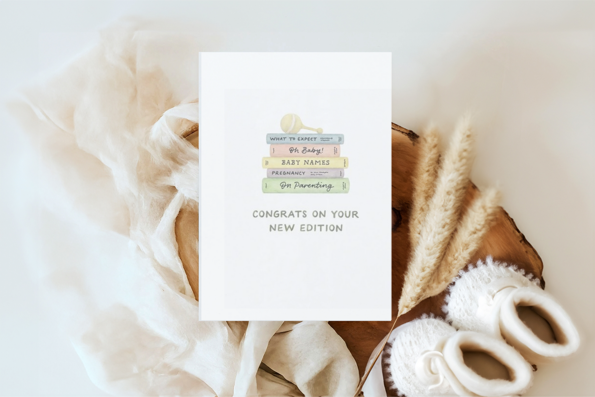 Celebrate the arrival of a new little one with this charming "Congrats on Your New Edition" card. Featuring a whimsical stack of baby-related books, such as "What to Expect," "Oh Baby!," "Baby Names," and more, this card adds a playful and thoughtful touch to any baby announcement or baby shower. The soft pastel colors and lighthearted design make it a perfect way to congratulate new parents on their exciting new chapter.