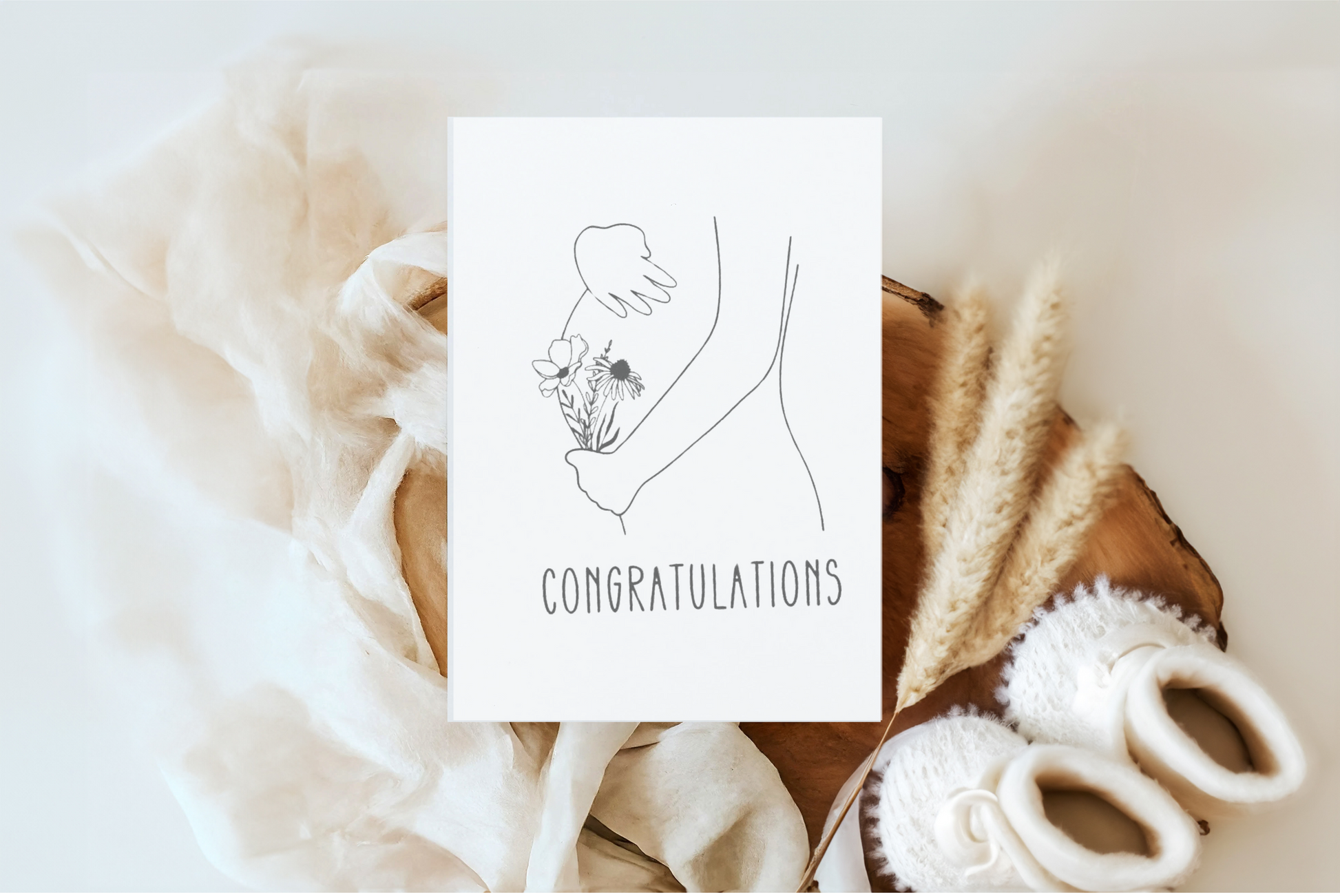 Celebrate a special moment with this elegant "Congratulations" card. Featuring a minimalist, hand-drawn illustration of a pregnant figure holding flowers, this design conveys love and warmth in a simple yet meaningful way. Perfect for a pregnancy announcement, baby shower, or any occasion that calls for heartfelt congratulations.
