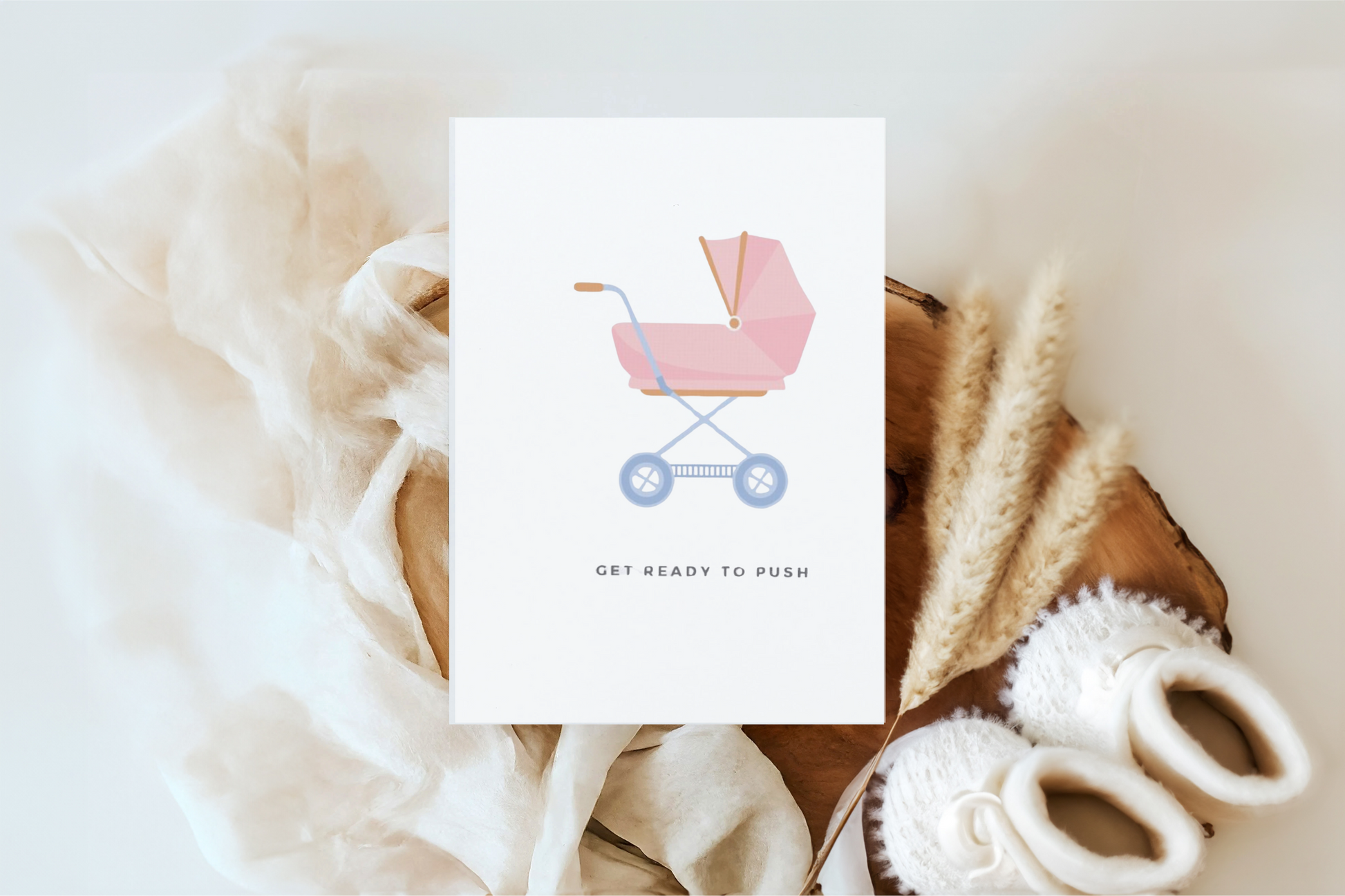 Get ready to celebrate the excitement of parenthood with this fun "Get Ready to Push" card! Featuring a cute hand-drawn illustration of a pastel-colored stroller, this card is perfect for baby showers, pregnancy announcements, or any moment that calls for a lighthearted and encouraging note. With its playful design and soft colors, it’s a fun way to show your support for the parents-to-be.