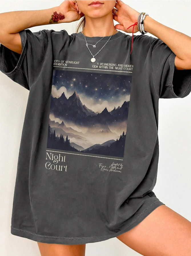 Step into the starlit skies of Velaris with our Night Court Oversized Tee, inspired by the breathtaking City of Starlight from A Court of Thorns and Roses. With its dreamy mountain scene and celestial details, this comfy graphic tee captures the magic, mystery, and strength of the Night Court.