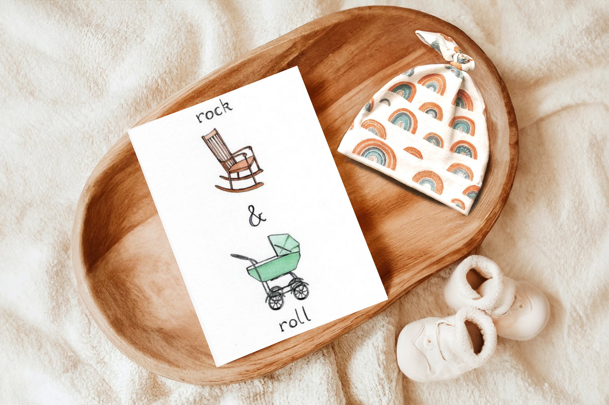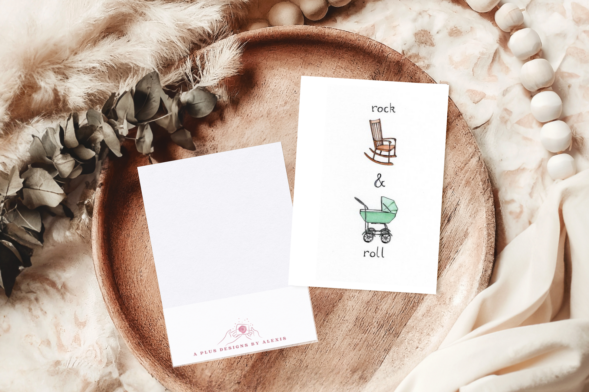 Celebrate the joyful journey of parenthood with this playful "Rock & Roll" card. Featuring a hand-drawn rocking chair and baby stroller, this card is perfect for baby showers, pregnancy announcements, or simply welcoming a little one into the world. The charming design and whimsical typography make it a fun and memorable way to congratulate new parents.
